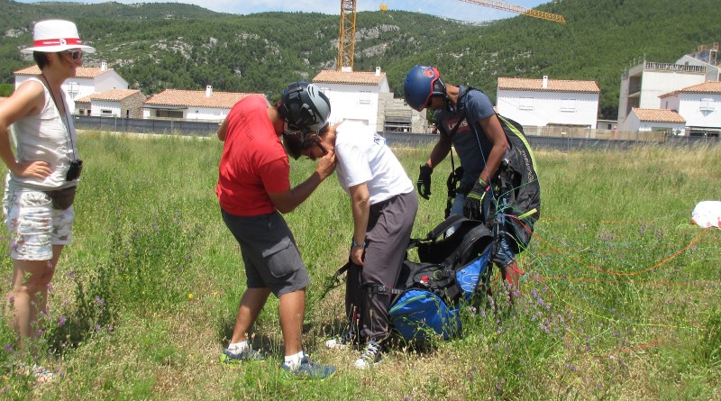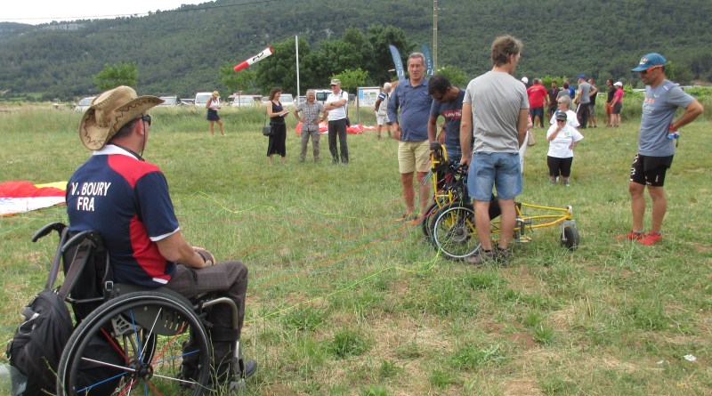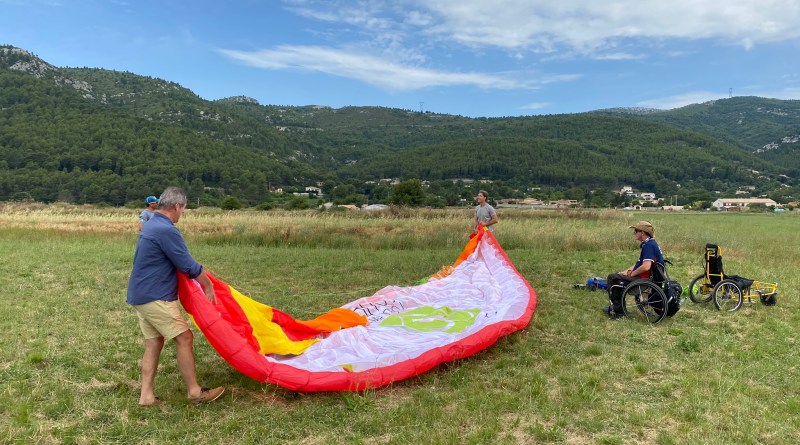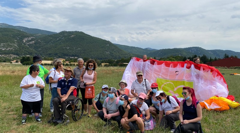 Nous avons tous été accueillis sur le site du club "Les Pins Volants" de l'école "Marseille Parapente" par son dirigeant Jean-Christophe LANDREAU. Le président François-Michel GALLAND de la ligue PACA de vol libre nous y a rejoint. La Presse Var Matin de Signes et La Provence d'Aubagne étaient invitées à cet événement. Dans un premier temps, Michel CAPRON président du Fonds de Dotation Handicap Solidarité de Lançon deProvence a remis un chèque de 6100,80€ à Vincent BOURY paraplégique, président de l'association ADONF de Cornillon en Trièves pour l'aide au financement d'un parapente biplace pour personne en situation de handicap. Entourés de Laure PARMENTIER et Francis TROUILLET de ADONF et Jany BAYOL et Elisabeth CASTELLAN du Fonds de Dotation Handicap Solidarité. Pour cet évènement, ADONF et le Fonds de Dotation Handicap Solidarité ont offert à 8 personnes en situation de handicap du foyer de Vie « Mon Village » de Velaux de faire leur baptême de vol en parapente pilotés par Olivier et Didier de l'école Marseille Parapente . Yassin, Sabah, Josiane, Dorian, Mégane, Fabienne, Françoise et Emilie très volontaires ont été enchantés et heureux de ce premier vol. Barbara, Mélissa ont suivi une initiation au parapente avec Francis TROUILLET de ADONF et ont assisté aux vols de leurs collègues. Les monitrices éducatrices Justine, Sandrine et leur chef de service Isabelle SCLAVO de Mon Village les accompagnaient. Ce fut une journée riche d'émotions et de valeurs humaines. Quelle récompense que de voir ces visages radieux réalisant leur rêve de voler en parapente pour la première fois…