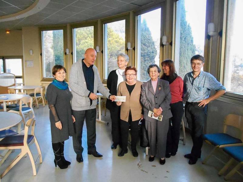 Le 13 décembre 2013, à la Maison du Mineur à Vence (06), Michel CAPRON, en qualité de Président du Fonds de Dotation Handicap Solidarité, accompagné d’Elisabeth CASTELLAN, secrétaire, a remis à l’association « Apprendre, Transmettre et Partager » un chèque de 4 000€ afin de financer des équipements permettant de faire entrer la musique vocale et instrumentale, ainsi que le théâtre, dans les établissements de soins, pour améliorer la vie quotidienne des personnes hospitalisées et en situation de handicap. Ces inclusions culturelles permettent aux résidents d’avoir une nouvelle vie sociale et affective en créant et en réalisant un projet culturel collectif, source d’épanouissement. S’exprimer c’est exister ; Exister c’est vivre ; Vivre c’est être en vie ; Etre en vie c’est résister à la maladie et au handicap. La responsable de ce projet « La Voix du Cœur », Brigitte MUNET, chef de chœur, a accueilli chaleureusement les représentants du Fonds Handicap Solidarité, avec deux autres membres de l’association, Fernande GRAQ et Christine REYNAULT, comptable de l’association, et des membres du personnel de la Maison du Mineur, dont le docteur Frédéric VANDENBOS, pneumologue. Le site est situé sur les hauteurs de Vence et bénéficie d’un magnifique panorama avec vue sur mer. L’association Apprendre, Transmettre et partager, qui œuvre sur ce centre de réadaptation fonctionnelle cardiologique et pneumologique, travaille également sur le Centre de rééducation fonctionnelle Héliomarin de Vallauris. Apprendre, Transmettre et partager est associée depuis 2009 au programme Culture et Santé, convention nationale signée entre les ministères de la Santé et de la Culture. Le Fonds Handicap Solidarité adhère aux valeurs « d’Apprendre Transmettre et Partager » ; elles apportent du bien être aux personnes hospitalisées et leur permet momentanément d’oublier tous leurs maux. Le Fonds Handicap Solidarité a donc décidé de soutenir ce projet. Les témoignages écrits des résidents témoignent du bien fondé de ce soutien.