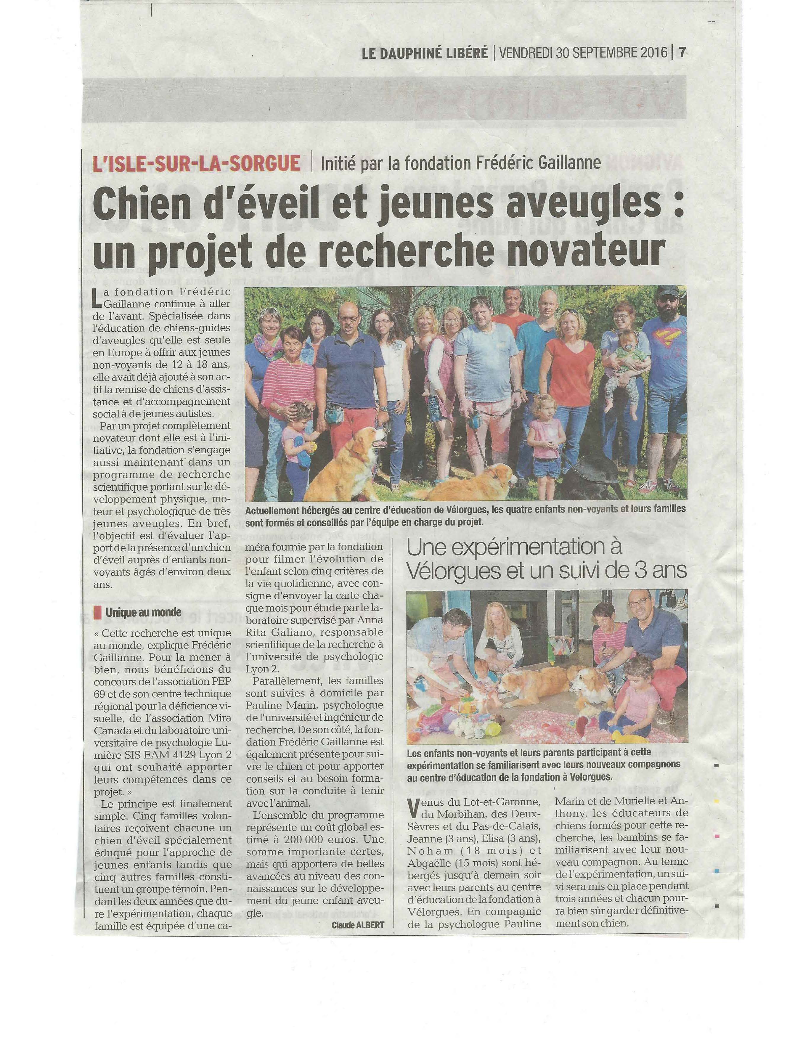 Le Fonds de Dotation Handicap Solidarité co-finance un projet de recherche innovant sur les chiens d’éveil pour enfants aveuglent de 15 à 20 mois. Mira Europe est la première école de chiens-guides spécifiquement destinés à des enfants déficients visuels à partir de l’âge de 12 ans, dans toute l’Europe. La Fondation éduque sur son site, à L’Isle-sur-la-Sorgue (Vaucluse) les chiens-guides qu’elle remet gratuitement à des enfants français et européens âgés de 12 à 18 ans. Cette fois la Fondation Frédéric GAILLANNE décide d’aller encore plus loin en lançant le premier programme de recherche les enfants aveugle de 15 à 20 mois. 4 familles et 4 chiens d’éveil participent au programme expérimental. Les scientifiques suivront l’évolutions des enfants aux travers de différents ateliers filmés que les familles enverront chaque mois pendant 4 ans. L’ensemble du programme est estimé à 200 000 euros.