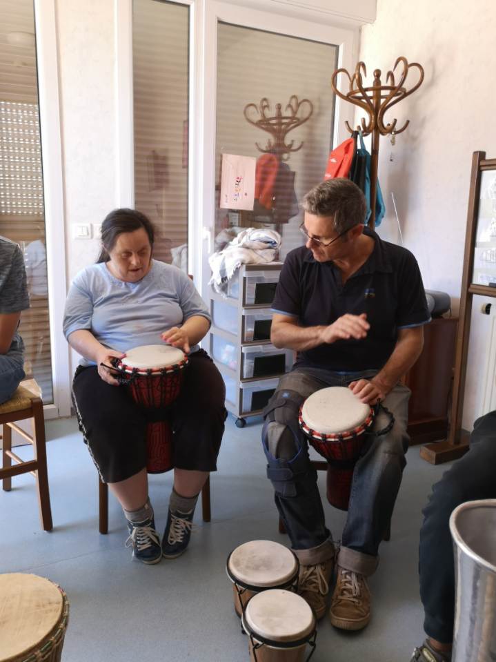 Depuis 2 ans1/2, un atelier « percussions » a été mis en place en collaboration avec l'association « Tétines et Biberon » le jeudi après-midi au foyer Mon Village. L'intervenant Christophe LECORDIER propose 2 séances de ¾ d'heure chacune, pendant lesquelles il sensibilise les résidents au rythme, à la musique, au chant mais en même temps, il leur apprend à travailler ensemble, à partager des exercices dans le respect de chacun. L'objectif 1er de ces séances est de prendre du plaisir et s'exprime chacun à sa façon. A quelques mois près, un atelier « théâtre » à vu le jour, tous les mardi après-midi au foyer Mon Village. L'intervenante Katy KASPRZAK propose également 2 séances : elle favorise avec les groupes l'expression des émotions, la création, l'imagination, l'improvisation, tout en travaillant sur le respect de l'autre. Par exemple, en partant d'un conte comme « le petit chaperon rouge », Ces 2 ateliers ont beaucoup de succès, de nombreux résidents souhaitent y participer.Chaque fin d'année, des présentations d'ateliers sont faites pour montrer le travail effectué tout au long de l'année. Auteure : Isabelle SCLAVO, chef de service éducatif, Foyer Mon Village