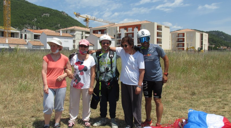 Nous avons tous été accueillis sur le site du club "Les Pins Volants" de l'école "Marseille Parapente" par son dirigeant Jean-Christophe LANDREAU. Le président François-Michel GALLAND de la ligue PACA de vol libre nous y a rejoint. La Presse Var Matin de Signes et La Provence d'Aubagne étaient invitées à cet événement. Dans un premier temps, Michel CAPRON président du Fonds de Dotation Handicap Solidarité de Lançon deProvence a remis un chèque de 6100,80€ à Vincent BOURY paraplégique, président de l'association ADONF de Cornillon en Trièves pour l'aide au financement d'un parapente biplace pour personne en situation de handicap. Entourés de Laure PARMENTIER et Francis TROUILLET de ADONF et Jany BAYOL et Elisabeth CASTELLAN du Fonds de Dotation Handicap Solidarité. Pour cet évènement, ADONF et le Fonds de Dotation Handicap Solidarité ont offert à 8 personnes en situation de handicap du foyer de Vie « Mon Village » de Velaux de faire leur baptême de vol en parapente pilotés par Olivier et Didier de l'école Marseille Parapente . Yassin, Sabah, Josiane, Dorian, Mégane, Fabienne, Françoise et Emilie très volontaires ont été enchantés et heureux de ce premier vol. Barbara, Mélissa ont suivi une initiation au parapente avec Francis TROUILLET de ADONF et ont assisté aux vols de leurs collègues. Les monitrices éducatrices Justine, Sandrine et leur chef de service Isabelle SCLAVO de Mon Village les accompagnaient. Ce fut une journée riche d'émotions et de valeurs humaines. Quelle récompense que de voir ces visages radieux réalisant leur rêve de voler en parapente pour la première fois…