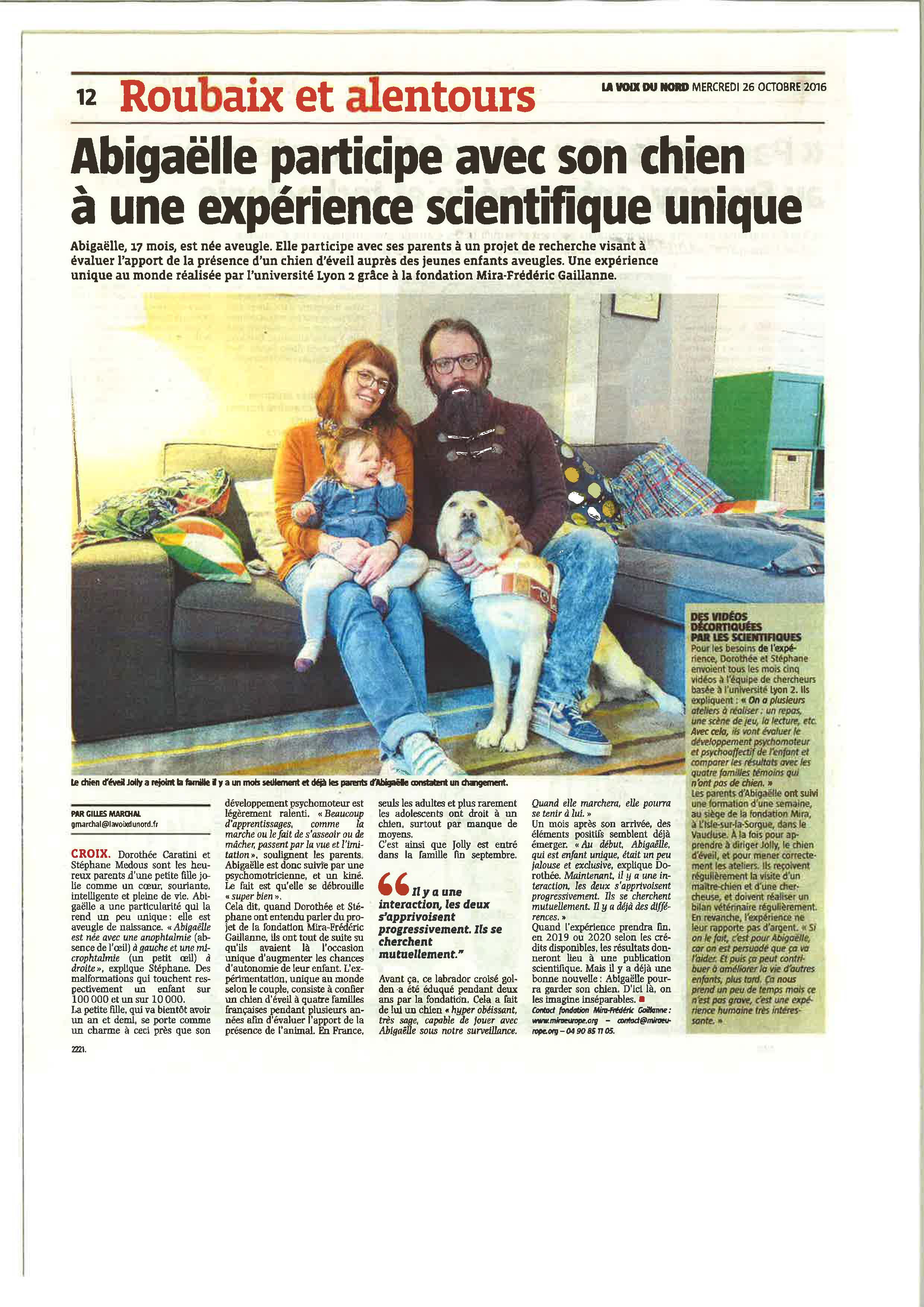 Le Fonds de Dotation Handicap Solidarité co-finance un projet de recherche innovant sur les chiens d’éveil pour enfants aveuglent de 15 à 20 mois. Mira Europe est la première école de chiens-guides spécifiquement destinés à des enfants déficients visuels à partir de l’âge de 12 ans, dans toute l’Europe. La Fondation éduque sur son site, à L’Isle-sur-la-Sorgue (Vaucluse) les chiens-guides qu’elle remet gratuitement à des enfants français et européens âgés de 12 à 18 ans. Cette fois la Fondation Frédéric GAILLANNE décide d’aller encore plus loin en lançant le premier programme de recherche les enfants aveugle de 15 à 20 mois. 4 familles et 4 chiens d’éveil participent au programme expérimental. Les scientifiques suivront l’évolutions des enfants aux travers de différents ateliers filmés que les familles enverront chaque mois pendant 4 ans. L’ensemble du programme est estimé à 200 000 euros.